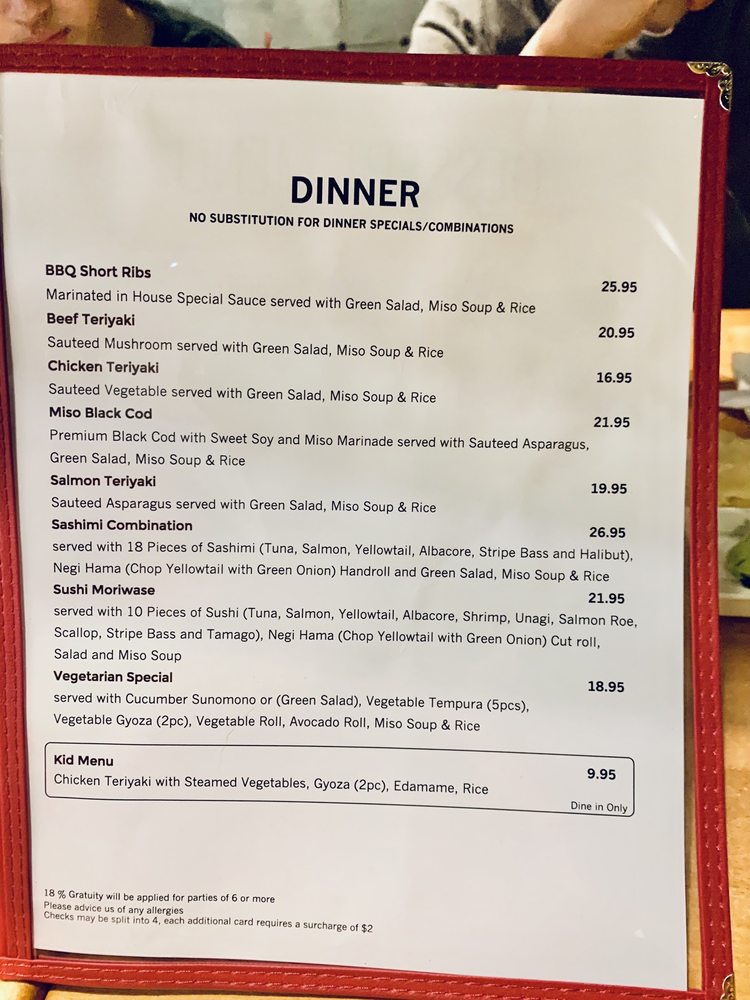 Served with 18 pieces of sashimi (tuna , salmon, yellowtail, albacore, stripe bass and halibut), negi hama hand roll (chopped yellowtail with green onion), green salad, miso soup & rice